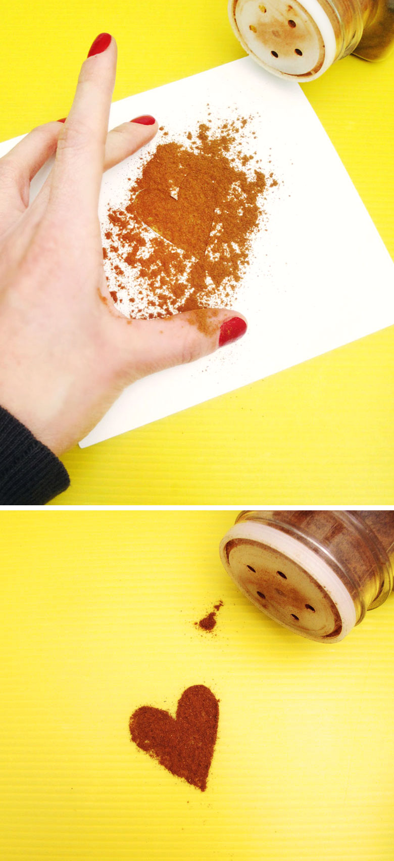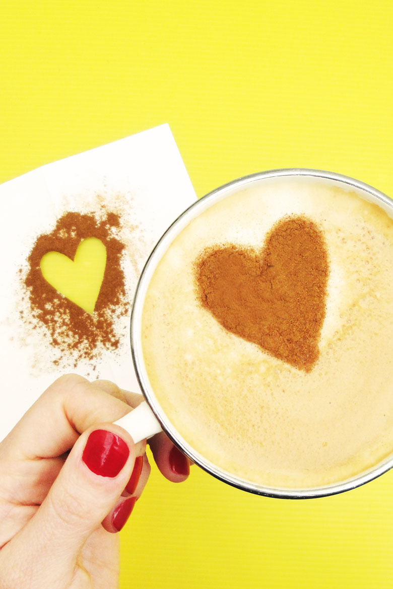 Este mini DIY se trata de una plantilla o esténcil totalmente casero, es facilísimo y sólo toma 3 minutos. Lo puedes usar para marcar un corazón sobre un café como yo lo hice aquí o bien, sobre fruta, pan tostado, hot cakes o lo que se te ocurra que puedas "espolvorear". Los ingredientes como cocoa, canela o azúcar glass son útiles para lograr este efecto; no hay límites para la imaginación en la cocina.