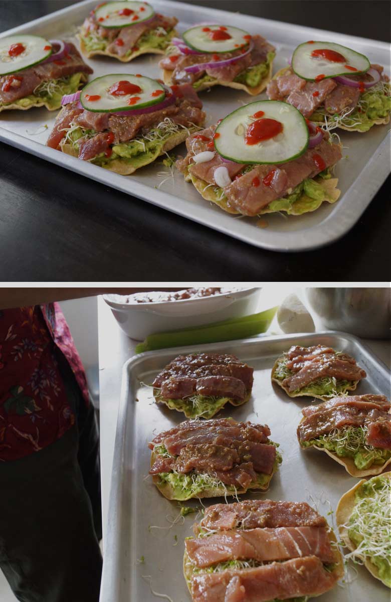 Una fresca base de guacamole y alfalfa coronada de lonjas de atún marinado en una salsa de chiles, especias y salsa sriracha, simplemente espectaculares.