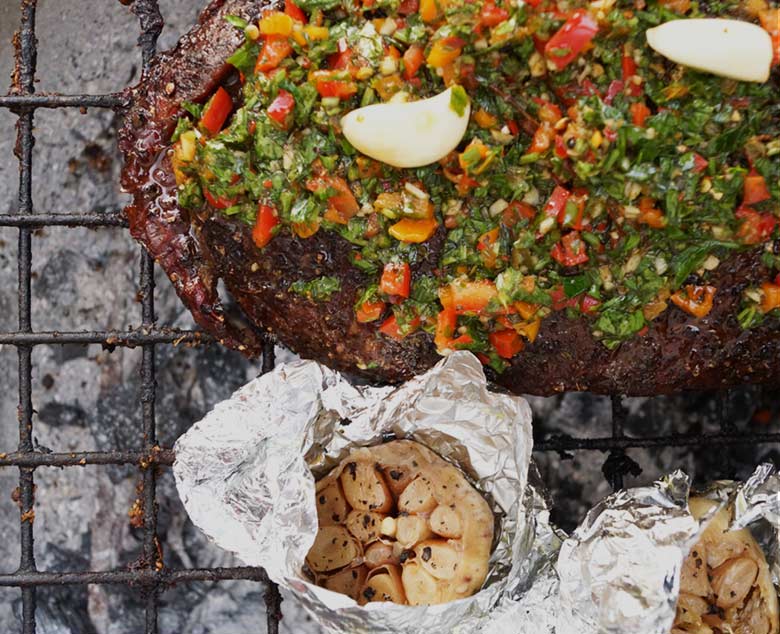 Pusimos en alumino ajos con aceite de olivo, sal y pimienta para usar su jugo sobre la preparación.