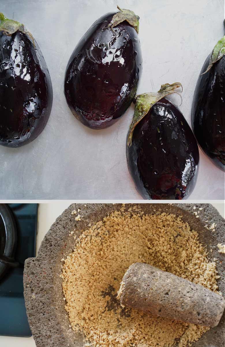 Deliciosas berenjenas que salieron del horno (foto arriba) para deleitar con cremosidad nuestro paladar. El tahini (pasta de semillas de sésamo) se hizo en molcajete.