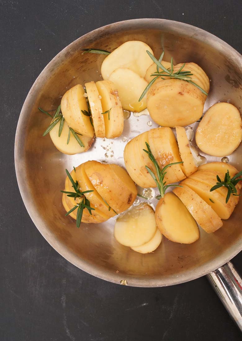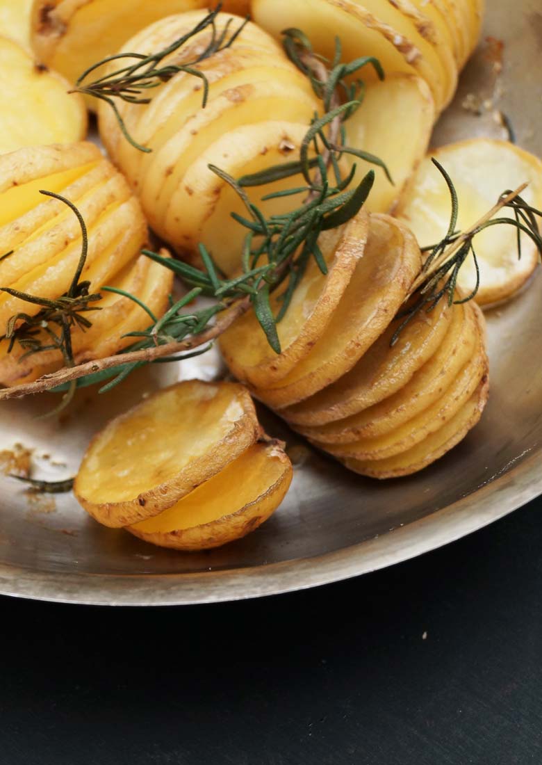 Como me gusta aprovechar el horno cuando lo prendo, agregué en otro sartén papas, aceite de olivo, sal y romero. Me encanta como unas simples papas se llenan de estilo y romanticismo con sólo unos pequeños cortes distintos.