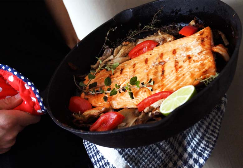 1.En un sartén o charola para hornear: engrasar con aceite de oliva y colocar el salmón